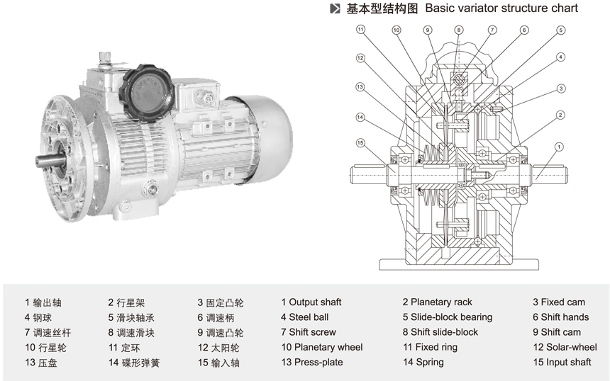 MB無級變速機基本結構圖有15個方面介紹:1、輸出軸 2、行星架 3、固定凸輪 4、鋼球 5、滑塊軸承 6、調速柄 7、調速絲桿 8、調速滑塊 9、調速凸輪 10、行星輪 11、定環(huán) 12、太陽輪 13、壓盤 14、碟形彈簧 15、輸入軸